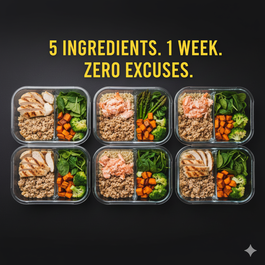 Meal prep doesn’t have to be complicated. You don’t need 47 ingredients, four hours, and a culinary degree. You need a formula, five ingredients, and the discipline to execute it weekly.